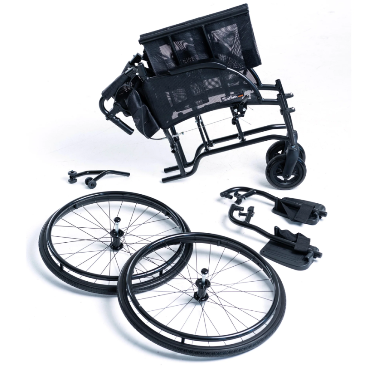 After the huge success, we had with our original Feather Chair which is the lightest (18” seat) wheelchair on the planet - we listened to our customers and decided to design a heavy-duty, 22” wide seat wheelchair with the same lightweight materials. And so we created the Feather Chair HD that can hold up to 350 or 450 lbs and only weighs 22/23 lbs. And 15/16 lbs. with the pop-off wheel option!